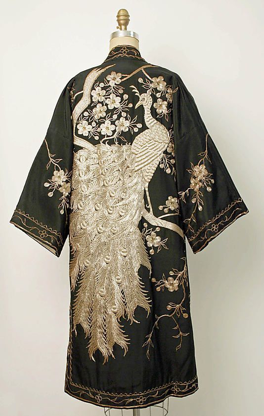 La veste kimono est plus généralement faite de soie épaisse, sur laquelle se déploient d’imposants motifs asiatiques: des bambous, des oiseaux, des compositions florales… On importe de Chine le col mandarin et du Japon l’encolure châle. L’ensemble est ceinturé à l’aide d’une bande d’étoffe assortie, que l’on retrouve également sur les robes de maison et peignoirs, plus modestes, faits de coton ou de flanelle.