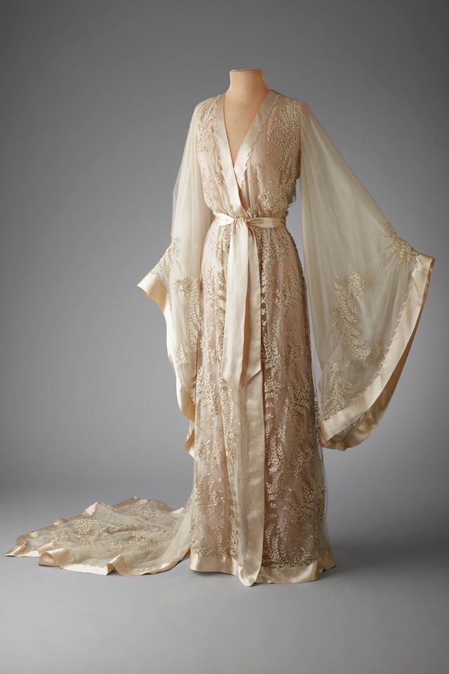 En été, on enfile par dessus, le négligé. Sorte de tunique faite de tissus riches, comme le velours, le satin ou la crêpe, les manches sont imposantes, et décorées de garnitures voluptueuses, de franges ou de volants.