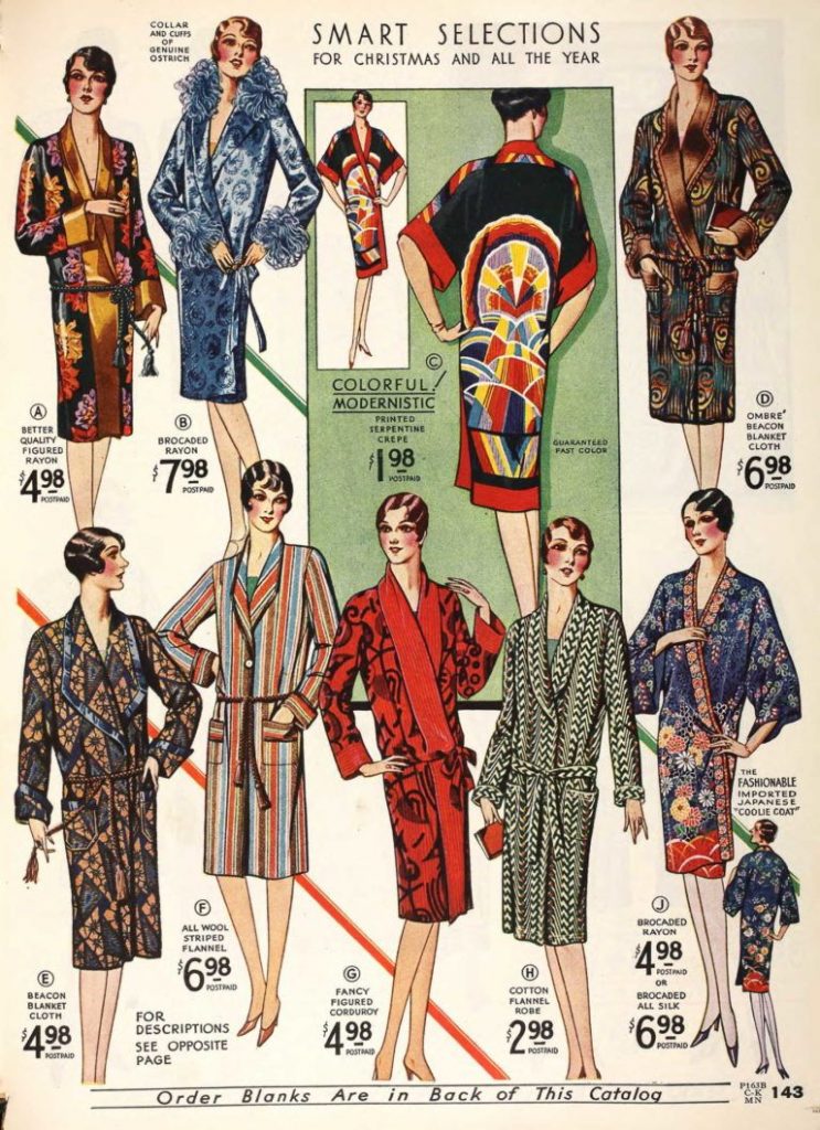 Mais c’est un engouement pour le Japonisme et le folklore Indochinois qui aura la plus grande influence sur le vêtement de chambre. Les filatures lyonnaises se mettent à la fabrication d’étoffes de soies et brocards, imprimées, tissées ou ostentatoirement lamées d’or et d’argent. Le manteau kimono en soie japonais est rendu populaire par le designer Paul Poiret, s’inspirant du Ballet Russe. Mais rien n’égalera la somptuosité des pièces importées d’Inde et de Chine par les plus riches clientes. La tendance est lancée, et la fabrication française permet aux classes plus populaires de satisfaire leur envies d’exotisme.