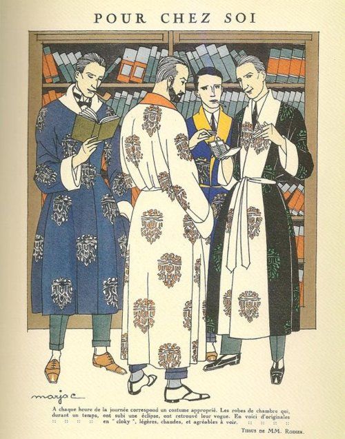 C’est l’arrivée du chauffage dans les foyers qui popularisera le vêtement d’intérieur, qui est alors à l’époque l’intermédiaire entre le jour et la nuit. Elégamment orné, le pyjama contraste avec le costume de jour qui est, lui, particulièrement austère. Monsieur enfile le pyjama sous sa veste fumeur, afin de pouvoir se prélasser, sans pour autant froisser son habit de journée. Il restera longtemps une option luxueuse, car il est exceptionnel de posséder des vêtements à l’usage aussi spécifique que le confort…