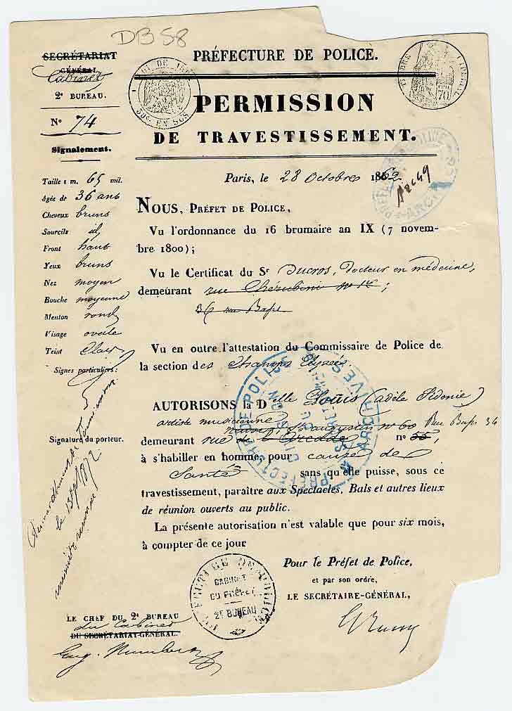 Alors pour les femmes, soumises à diverses formalités absurdes en ce qui concerne leurs apparats, l’occasion est toute trouvée pour se jouer des codes. En effet, nous sommes en 1846 et jusqu’au 20e siècle, le port du pantalon est interdit aux femmes. L’ Ordonnance du 7 novembre 1800 « concernant le travestissement des femmes » impose une autorisation délivrée par la police, attestant la nécessité médicale pour porter un tel vêtement…
