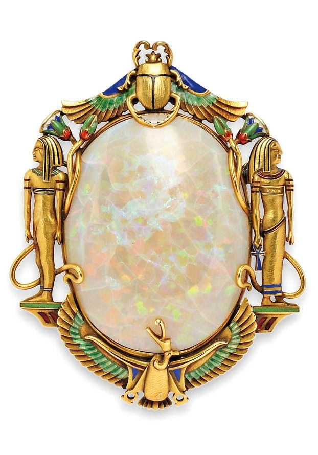 Les symboles d’inspiration « hiéroglyphes » deviennent des motifs qui parent les vestes kimonos et les robes tubulaires. Des insectes, des pyramides, le scarabée ou la fleur de lotus, se dessinent en broderies luxueuses, bijoux, broches et autres boucles de ceintures. On orne l’ensemble de pierres, plus ou moins précieuses, de peaux de reptiles, de lourdes pièces de monnaie.