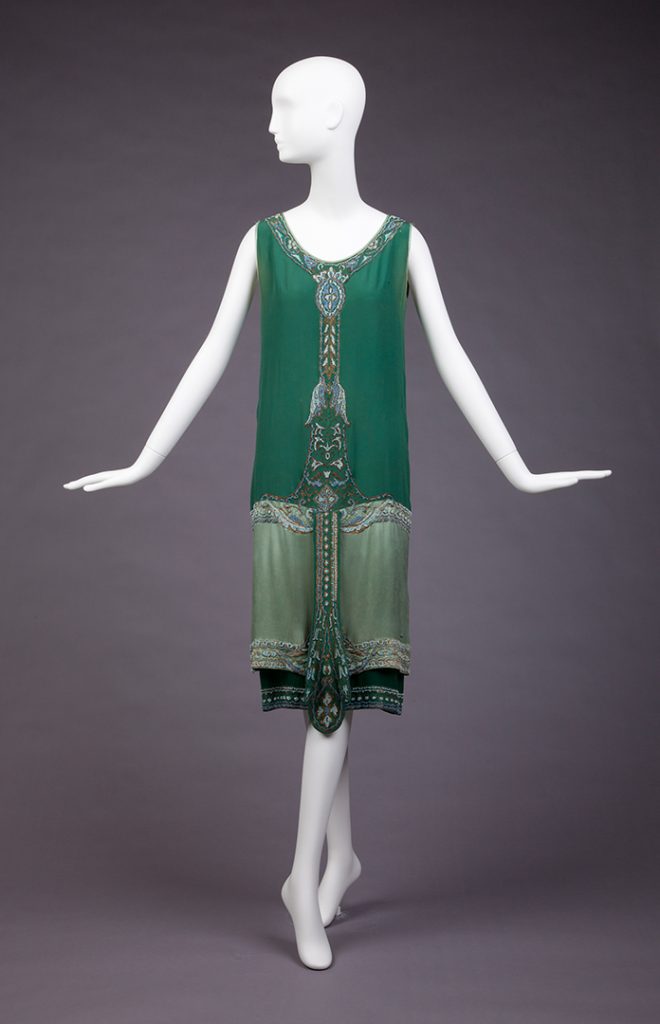 Les robes et jupes sont parsemées de centaines de ces paillettes, qui charmeront les Flappers, icônes et idoles des « Roaring Twenties », et figures de proue du look classique de cette mode féminine des années 1920.