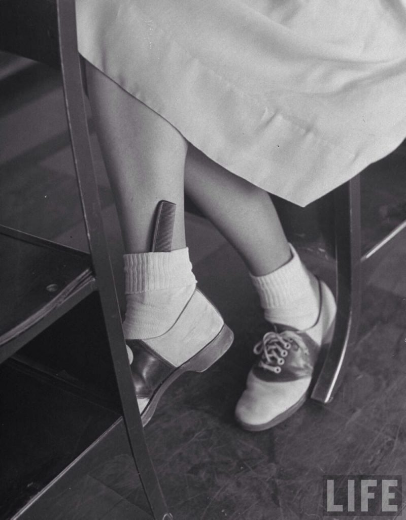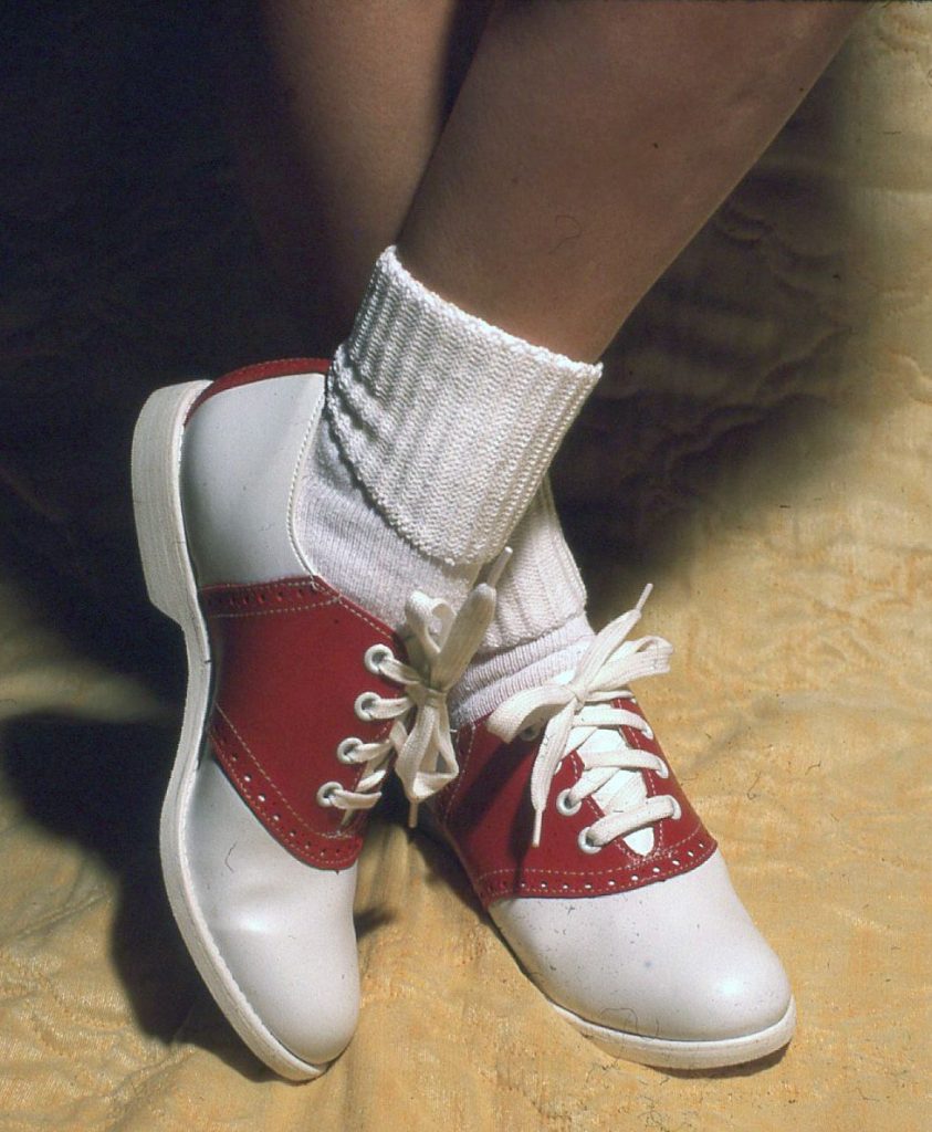 Intégrée aux uniformes dans les lycées américains, elle devient la chaussure par excellence de la mode adolescente. En dehors des établissements scolaires, les jeunes filles l’ associent aux fameuses « Poodle-Dress » (ndlr les Jupes Caniches) et les garçons l’ intègrent à la célèbre combinaison jean bleu/tee-shirt blanc. Mais attention ! Si vous portiez des derby saddle, vos chaussettes se devaient d’être bien blanches et roulées avec précision. Véritable élément décoratif, elles sont repliées en une fois, de manière à tomber sur la cheville et parfaitement symétriques; on les appelle les chaussettes Bobby. Cet accessoire donnera même son nom à cette génération d’ado-dandy, les Bobby Soxer.