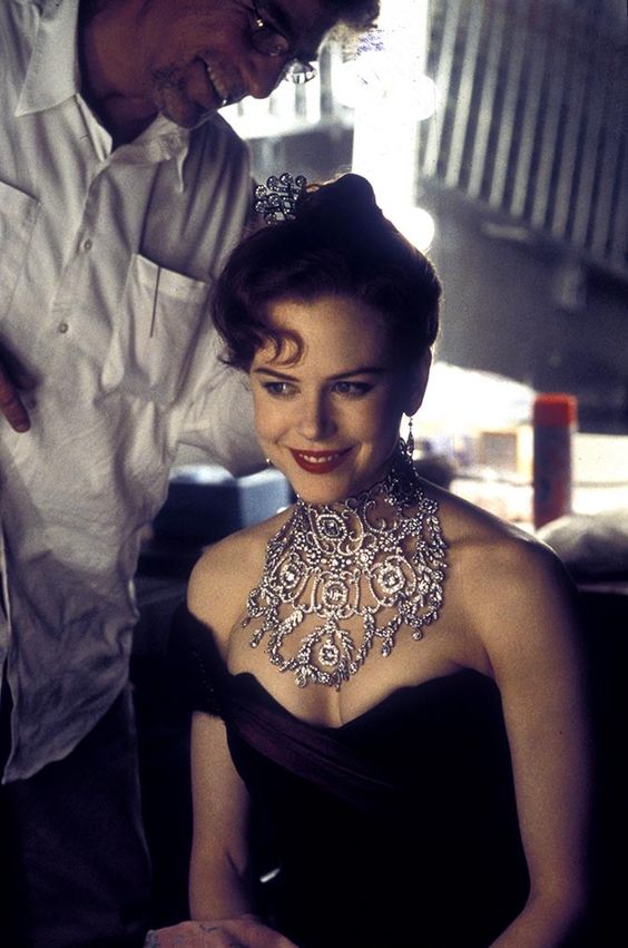 La fabrication du collier était un véritable travail de couture, le décolleté de Kidman a été mesuré avec précision, avant d’entamer quatre mois de travail à la main basé sur les techniques artisanales de l’époque. Selon des experts, ce bijou est une véritable prouesse, respectant particulièrement bien l’esprit de la somptueuse période du Moulin Rouge. Sa valeur était telle, que lors du tournage une reproduction d’argent et de cristaux (tout de même) était utilisée lors des scènes les plus intenses afin d’éviter tout accident. Presque aussi précieux que notre belle Kidman oscarisée, le collier, casi-humanisé sera renommé Satine.