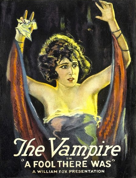 A Fool There Was (1915) y met en scène l’actrice Theda Bara dans ce personnage principal de femme vampirique. Elle se joue des faiblesses des hommes, elle les attire, les épuise. Son pouvoir de séduction est tel, qu’il cause la perte de qui se laisse charmer. Consumant les esprits, ne laissant qu’une enveloppe charnelle, comme un vampire aspirerait du sang, c’est ce rôle qui lui vaudra le surnom de Vamp, diminutif de vampire. Et qui deviendra le terme populaire pour désigner ces femmes séductrices, s’avérant dangereuses.